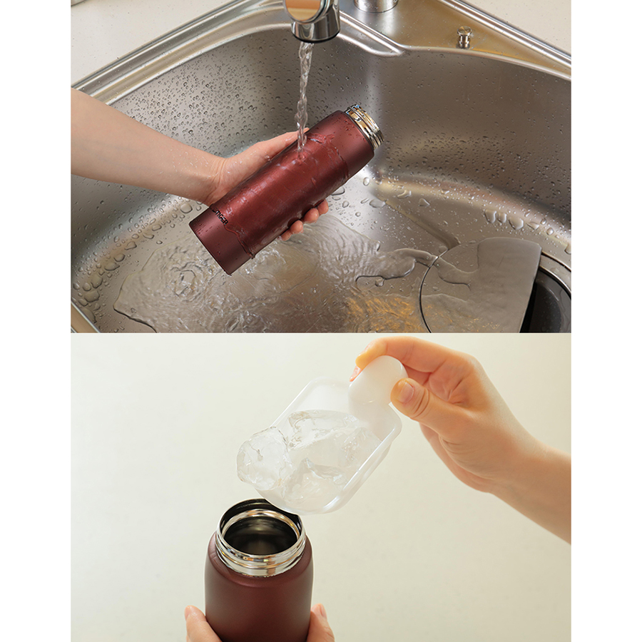 - Miệng bình bằng thép không gỉ được gia công dạng gọng nhẵn mịn và rộng dễ dàng bỏ đá viên hay uống trực tiếp cũng như thuận tiện vệ sinh.